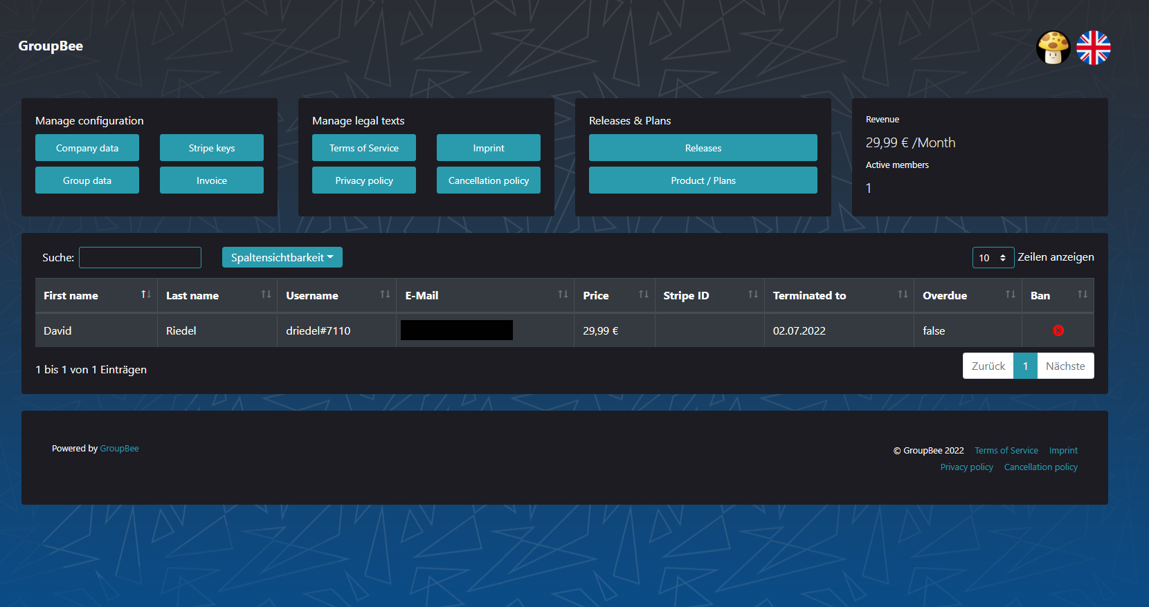 Du als Besitzer der Gruppe kannst alle Informationen in einem geschützten Bereich einsehen. Dort kannst du deinen GroubBee Auftritt individuell gestalten sowie deine Releases und Mitglieder verwalten. Als Besitzer der Gruppe hast du die Möglichkeit, nicht zahlende Kunden mit einem Klick aus der Gruppe zu entfernen und einen Wiedereintritt zu unterbinden. Kunden, bei denen die Zahlung fehlgeschlagen ist, werden dir in deinem Admin Dashboard visuell dargestellt.